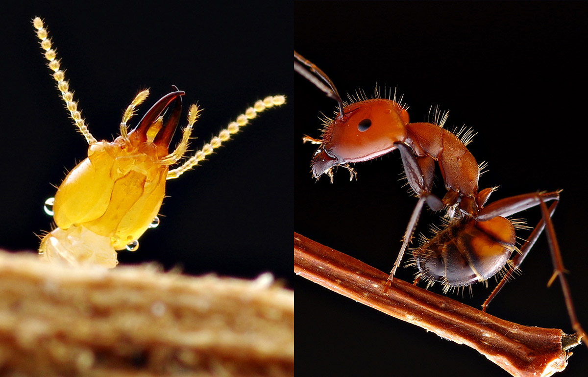 (2)白蚁的工蚁、兵蚁大多呈淡白色或灰白色,其胸腹间交接部分宽度差异不大。蚂蚁多数为黄色、褐色、黑色或橘红色,其胸腹间呈明显细腰状